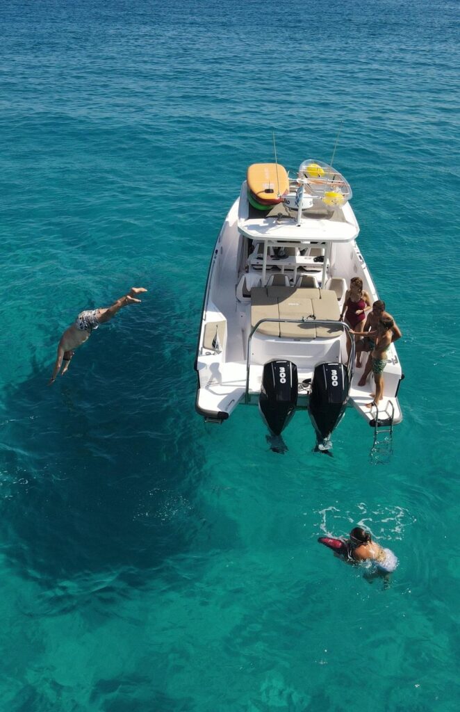 The experience is elevated by the vessel itself: modern, elegant, and fully equipped with premium amenities designed for comfort and indulgence. Complimentary SUP boards and sea scooters (scuba jets) allow you to explore the coastline dynamically, adding an element of playful adventure to the day.